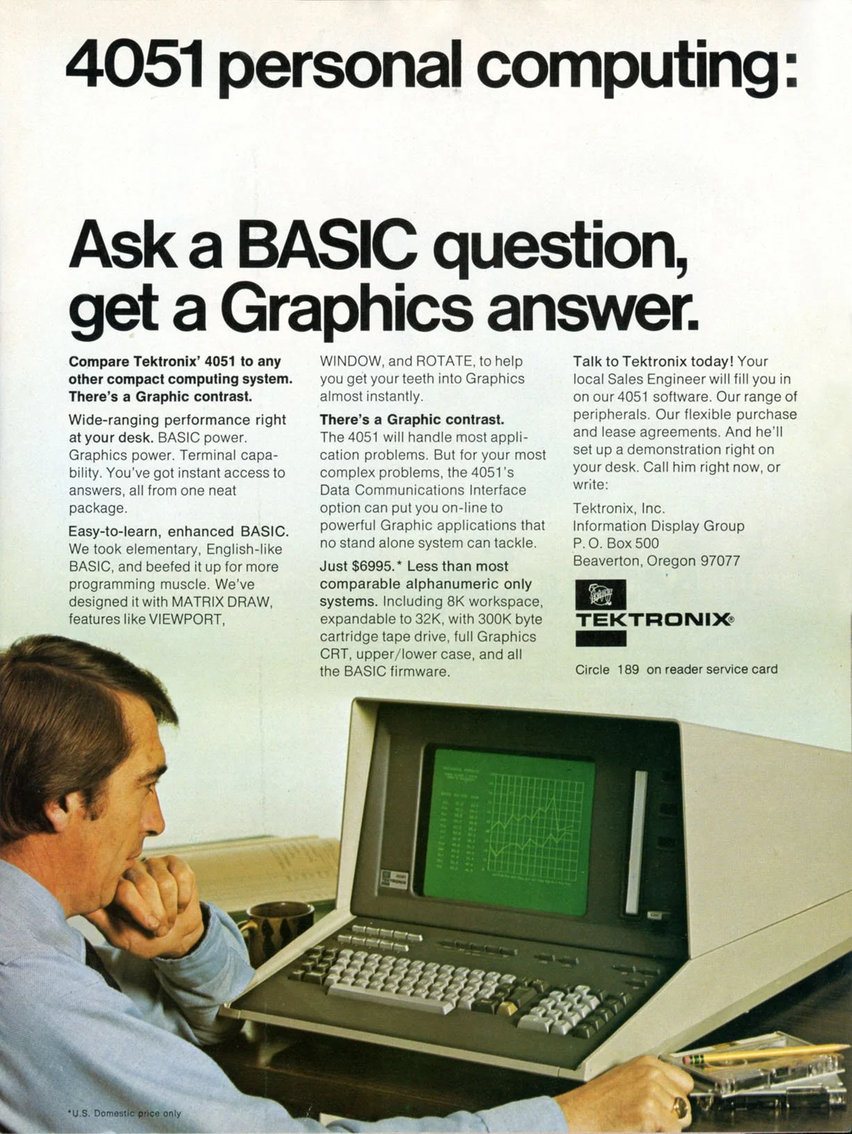 The Tektronix 4051 Graphic Computing System was introduced in October 1975. Highlight from brochure: “The individual user can keep personal projects local and uncomplicated. There are no sign-on protocols to interrupt the train of thought and no connect charges to worry about.” Step back in time below.